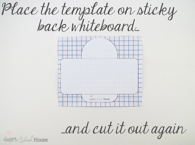 Next, you want to cut out a piece of the sticky back whiteboard that is slightly larger than the template (the grid they provide makes this simple!). Peel back the paper to reveal the sticky surface and carefully place the paper template on top of it so they adhere together. Then, cut out the shape of the template again like so: