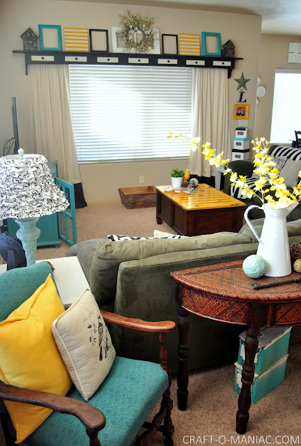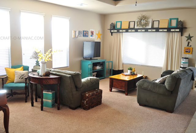 Hi guys, its been awhile since I have shared my family room. I made a few changes. The turquoise TV stand my hubby and I purchased earlier this year. We got it at Down East in S. Utah. I also taped off stripes and painted the top of our coffee table with Marigold Yellow spray paint by Rustoleum. I then chipped and sanded it like crazy and covered it in two coats of satin polyurethane, to protect the wood from drinks and what have you.