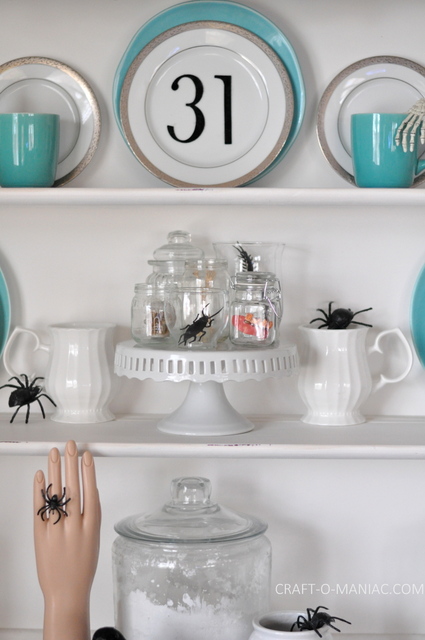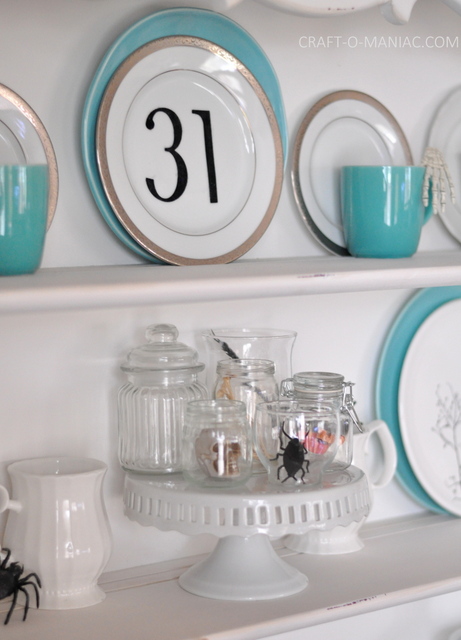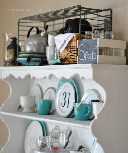 To create this look, I just shopped my dishes, and my Halloween decor and got creating. So here is my “Halloween Hutch Decor!”
