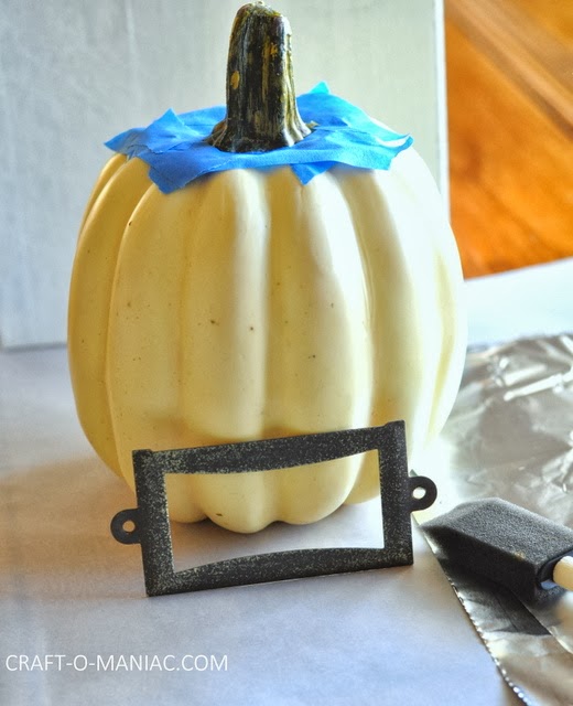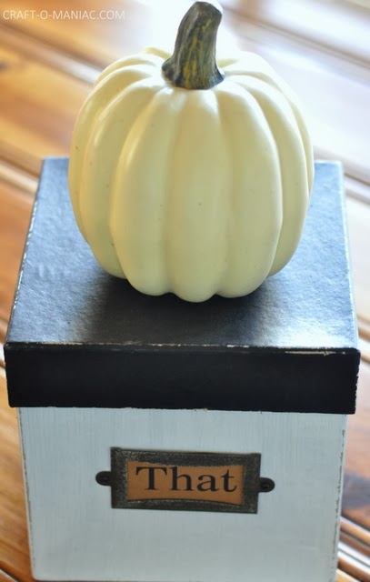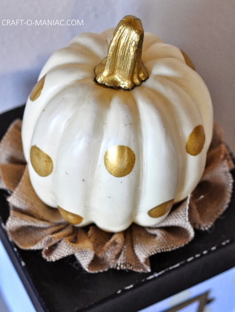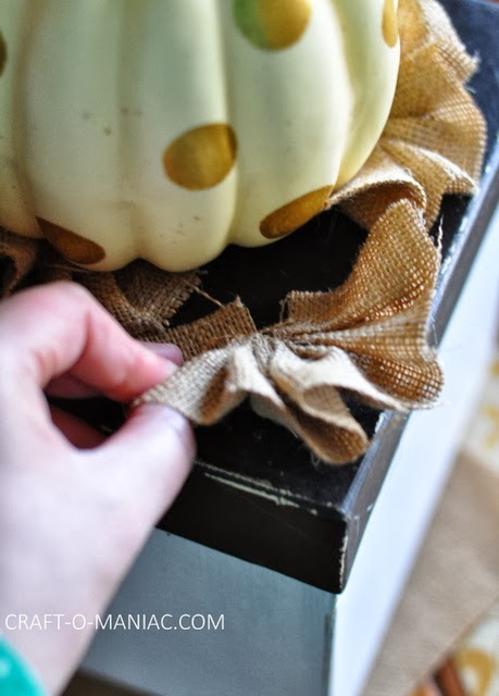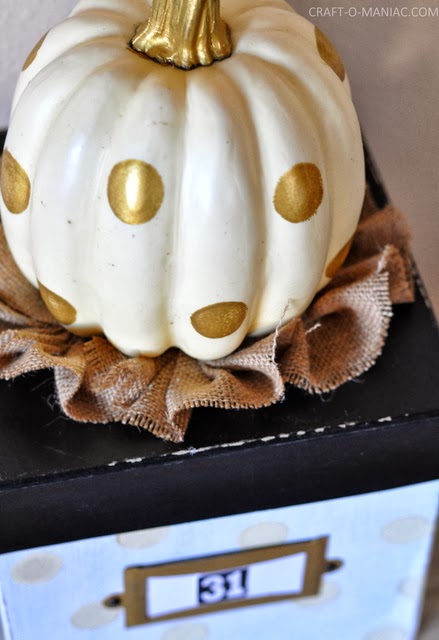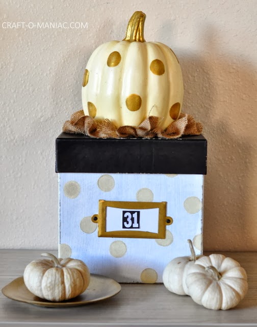I started with a box I actually had and previously had painted as well. I then took my pumpkin and taped around the bottom of the stem and painted the stem gold. Next I added gold polka dots. I hot glued the pumpkin to the lid. I then painted the metal tag cover gold as well. I let it dry and added it back on to the box. I cut out the number “31” out of some scrap paper and glued that in the center of the gold metal tag cover. Next I cut 2 inch strips of burlap ruffled the burlap adding hot glue in between each ruffle, and hot glued “4” ruffled strips to the top of the box, pushing it down and under the pumpkin. I lastly added some buttermilk polka dots to the front of the box.