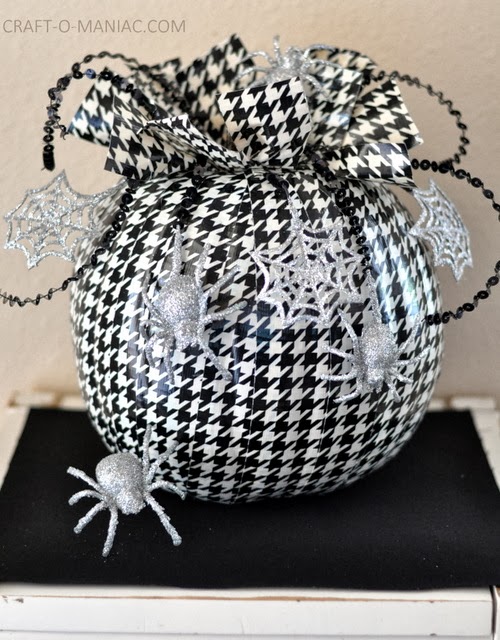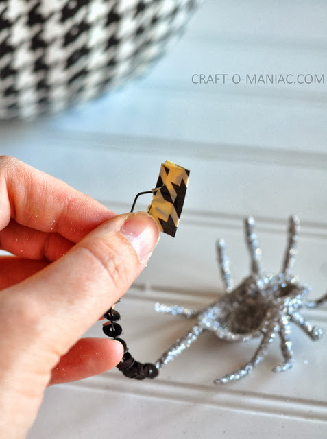 I then took pieces of Duck Tape® that were folded over in half and then folded up again bunching the ends and then I added them to the top of the pumpkin, hot gluing them down. Next I took some sequin stringed spiders and cob webs and cut them to the size I wanted. I would twist the ends and add Duck Tape® to the one end for hot gluing. Then the other end I would tie the metal in a knot. I then hot glued these pieces to the top of the pumpkin to embellish it some more.