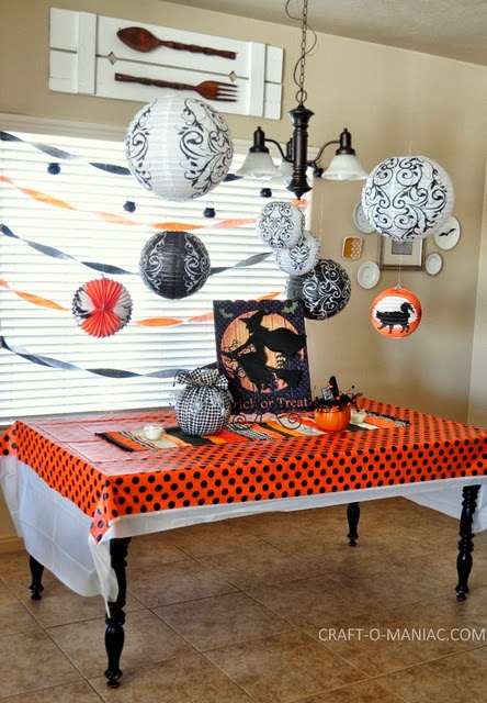 All the cute paper lanterns, the witch broom with wicked hands, and the cute black rod iron metal cat are all from Oriental Trading. Their cute stuff really made my party.