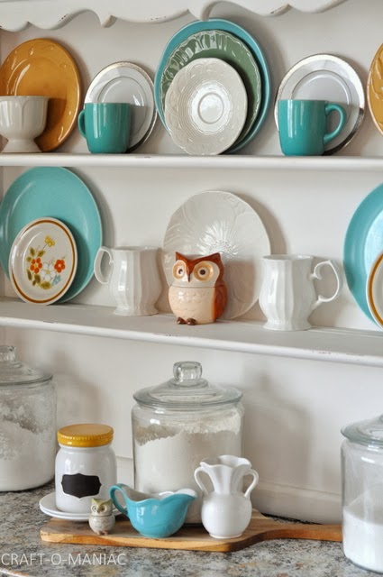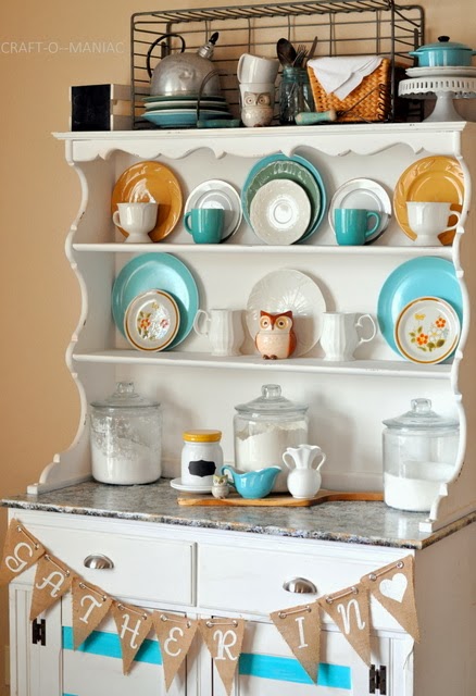 Its the time again… time to share my “Hutch!” I keep, for the most part the decor on the top the same, and I always seem to keep the turquoise (i love it!) as well. However, I mix in other items depending on what the holiday or theme is. So today I am sharing my “Fall Vintage Hutch” Most the dishes I have had, and others I pick up at thrift stores and such. (who loves cute dishes? “me!”) The cute owl measuring cups my mil got me a few years ago from World Market. A lot of the other vintage items are again thrifted or bought at antique stores. I added the cute burlap banner this year, and that is from David Tutera’s “Casual Elegance” wedding line. I also changed out the old hardware for some new ones.