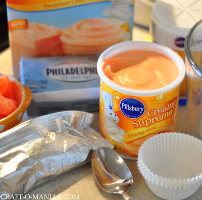 For the Frosting~ I took the entire container of Orange Creamsicle Frosting and added at room temperature a 1/2 brick of cream cheese. I mixed the two really well together. I also added in 2 tbsp. of powdered sugar, and it mixed again.Then I frosted the cupcakes, dusted them lightly with powdered sugar, and added some sugary orange gummy wedges to the tops.