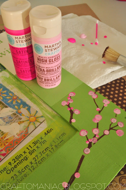 I used my Martha Stewart rolling pin for painting the Plaid craft frame I got at Walmart. I used 3 different Martha Stewart paints to complete the project. The green paint was mixed with another shade of green paint I had, along with a green Martha Stewart paint. I cut out vinyl and painted over it, then when the paint was all dry I carefully peeled off the vinyl. I Stenciled the bird and branch with one of my Martha Stewart stencils, and mixed two Martha Stewart pink paints to create the blossoms on the stenciled tree.